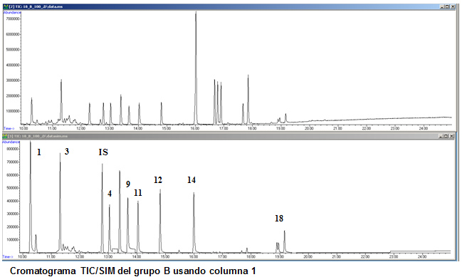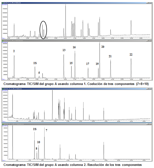 La columna 1 permite separar los alergénicos de los grupos A y B, siendo necesaria la columna 2 para separar citral, hydroxycitronellal y cinnamic aldehyde del grupo A que coeluyen. Los resultados muestran la capacidad del sistema de separar 22 alergénicos en una sola secuencia de análisis, con una buena selectividad, empleando una única configuración de 2 columnas conectadas al splitter microfluídico y al MSD (SIM/SCAN) como sistema de detección.