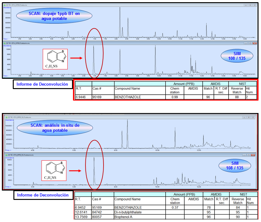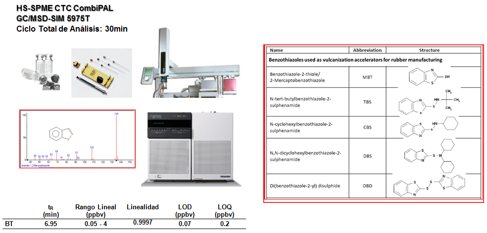 Los benzotiazoles pueden ser considerados contaminantes emergentes provenientes de la síntesis orgánica y son usados como aceleradores de la vulcanización en productos como los neumáticos a partir de los cuales pueden ser liberados en uso contaminando suelos y aguas. El presente sistema permite el análisis de benzotiazol (BT) y compuestos relacionados en aguas mediante la técnica HS-SPME-GC/MSD-SIM con derivatización in-situ sobre la fibra SPME. Consiste en un inyector PAL para la preparación de la muestra, que captan los analitos mediante derivatización(in-situ) sobre la fibra y posterior análisis por desorción de la fibra en el sistema GC/MSD-SIM.