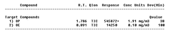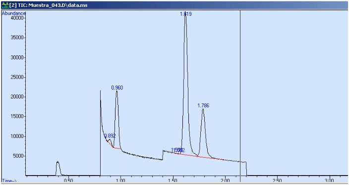 Ejemplo de cromatograma durante la monitorización en línea del OE y OP mediante GC-MSD-SIM