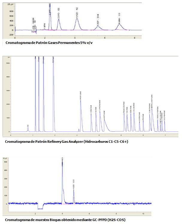 El sistema analítico se compone de un cromatógrafo de gases GC AGILENT 7890 con tecnología de inyección de gases, conexiones Fleximetal, y dotado de 3 sistemas paralelos de análisis, cada uno con inyector, columnas (pre-columna y columna) y detector (FID, TCD y PFPD).