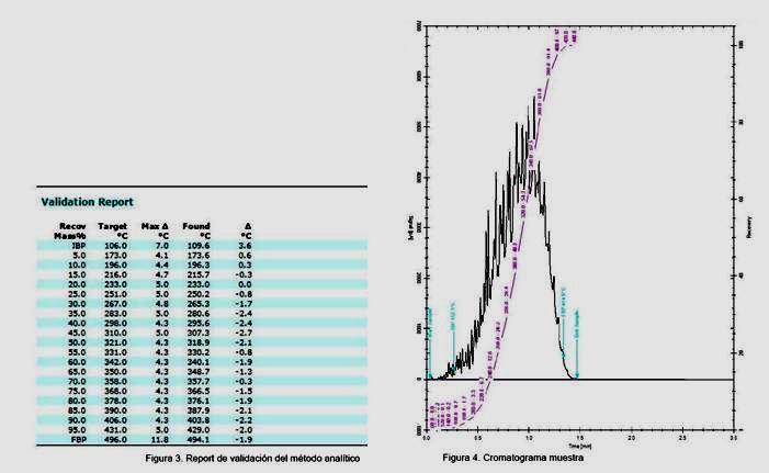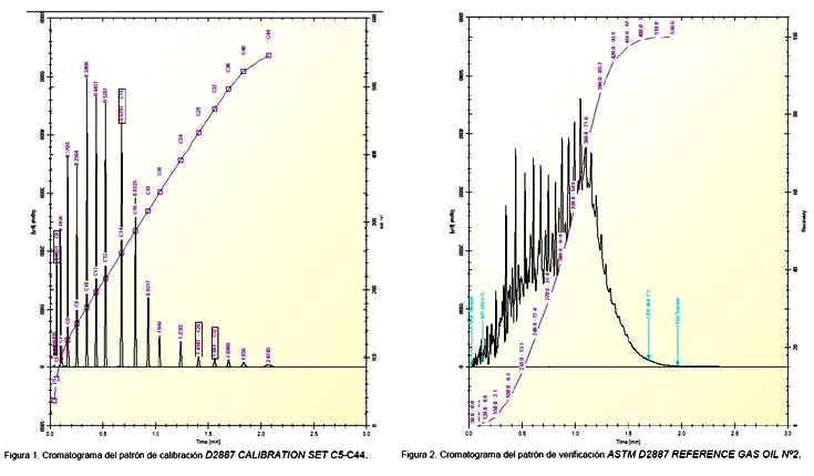 El método de análisis consiste en un croconvencionales. El inyector automático PAL acoplado al cromatógrafo de gases realiza la inyección conforme a ASTM D2887. El sistema está diseñado para la determinación de rangos de distribución de productos del petróleo de puntos de ebullición hasta 538 ºC (C5-C40) o 545 ºC (C5- C44), con una diferencia entre el punto de ebullición inicial (IBP) y el punto de ebullición final (FBP) mayor de 55 ºC. Los compuestos con puntos de ebullición superiores o aquellos que se adhieren a la columna cromatográfica de forma permanente, no se detectarán.matógrafo de gases basado en la tecnología Low Thermal Mass (LTM). Esta tecnología utiliza un modo de calentamiento resistivo, lo que permite la programación de rampas de temperatura muy rápidas y enfriamientos de columna extremadamente rápidos. Esta tecnología permite llevar a cabo análisis de Reference Gas Oil (RGO) en un tiempo de 2,5 min, alrededor de 6-7 veces inferior a los GC