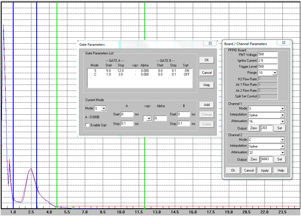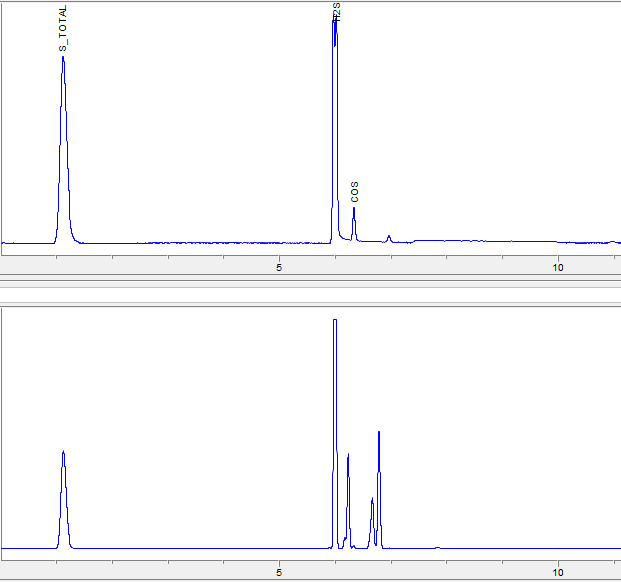 Cromatograma simultáneo del Canal Azufre (superior) y Canal Hidrocarburos (inferior) de un perfil de Diesel donde se observa el Azufre total y la especiación (H2S, COS y otros S):